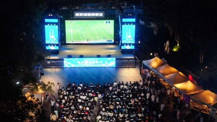 “苏超”比赛期间,江苏各地在部分商圈、街区设置“第二现场”,直播赛事,并设有游戏互动区、烟火市集区等。新华社图